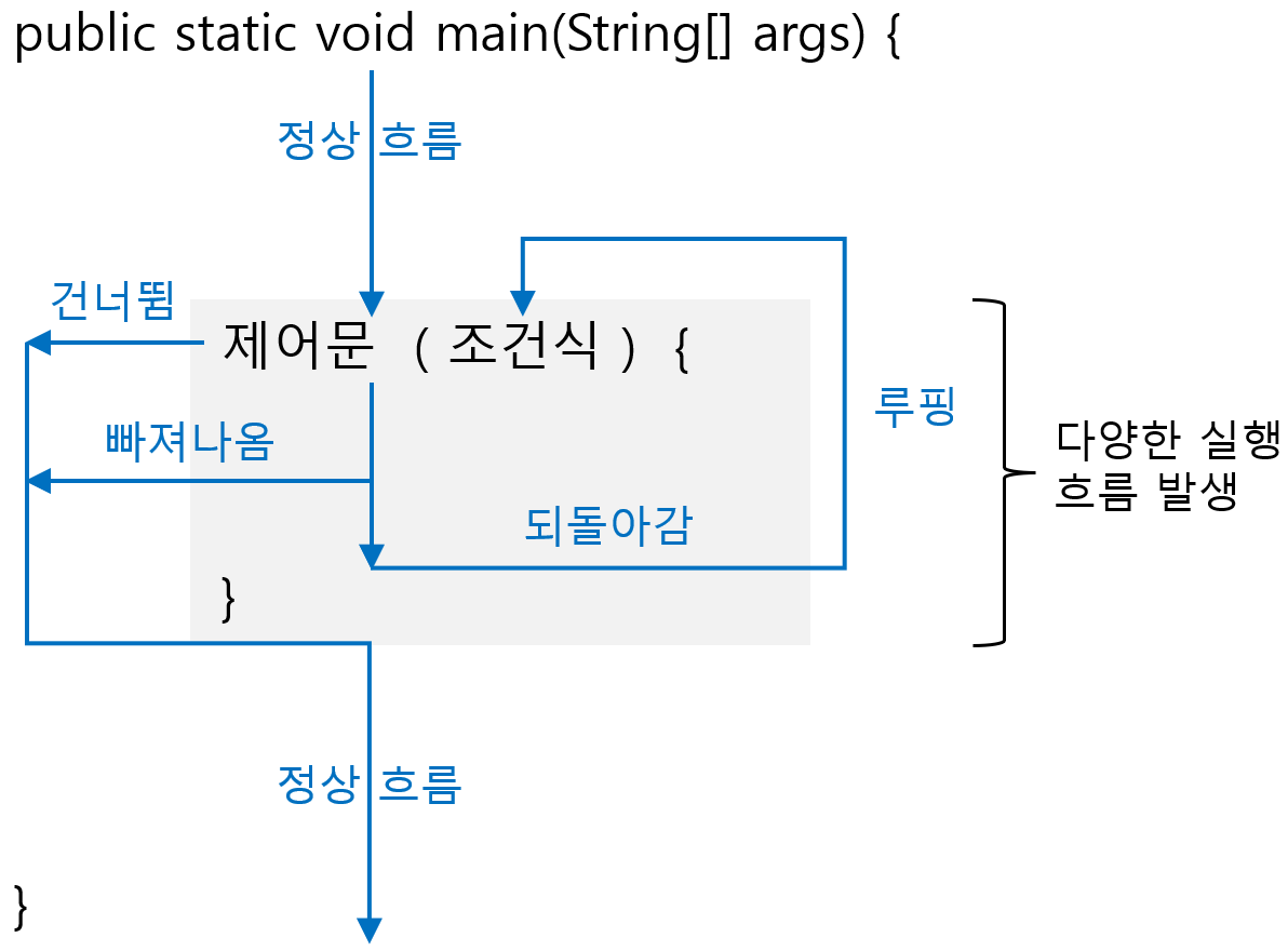 자바 프로그램은 main() 메소드의 시작 중괄호({)에서 끝 중괄호(})까지 위에서부터 아래로 실행하는 흐름이다. 이러한 실행 흐름을 흐름 제어문이 원하는 방향으로 바꿀 수 있도록 해준다.