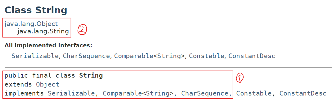 API 도큐먼트에서 String 클래스가 어떻게 정의되었는지 보려면 ① 선언부를 보면 된다. 여기서는 클래스가 final인지 추상(abstract)인지를 알 수 있고, 부모 클래스와 구현 인터페이스를 볼 수 있다. 전체 상속 관계를 보려면 ② 상속 계층도를 보면 된다.