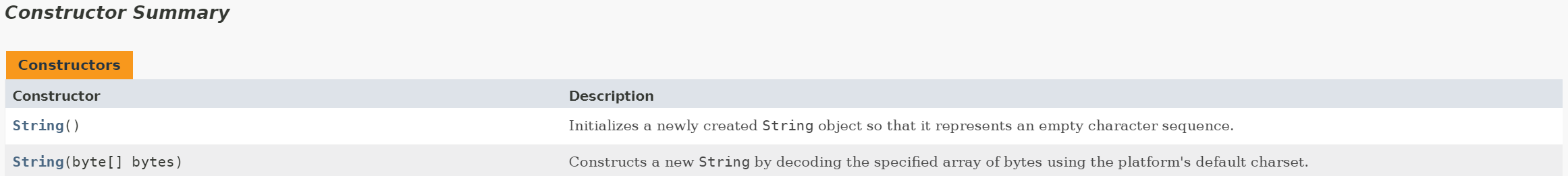 Constructor에서는 생성자의 매개변수 타입을 알 수 있고, Description은 이에 대한 간단한 설명이다. String 클래스는 매개변수 타입과 개수를 달리한 10개가 넘는 생성자들이 오버로딩되어 있다. 이 생성자들 중 하나를 이용해서 String 객체를 생성할 수 있다.