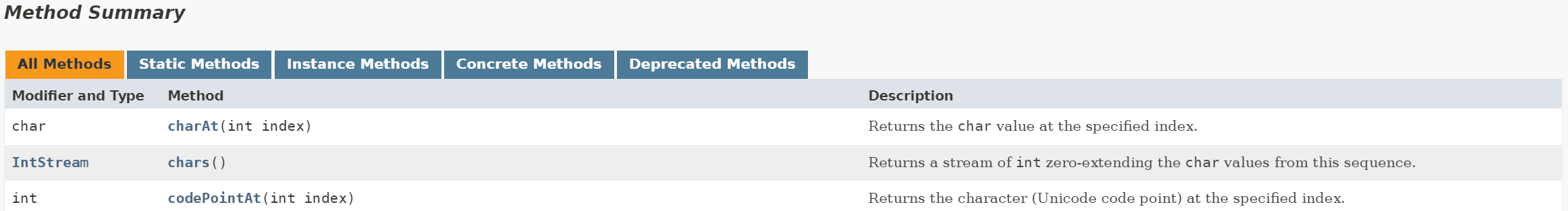 String이 가지고 있는 멤버를 보려면 상단 메뉴의 SUMMARY를 활용한다. SUMMARY는 선언된 멤버별로 이동하는 링크를 제공한다. 링크가 있으면 공개된(public, protexted) 멤버가 있다는 뜻이고, 링크가 없으면 공개된 멤버가 없다는 뜻이다.