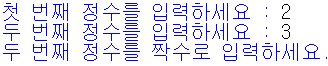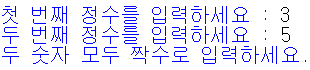 print("첫 번째 정수를 짝수로 입력하세요.")
