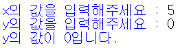 04. 다음 정보를 활용하여 두 정수를 입력받아 두 정수의 연산 값이 출력되는 프로그램을 작성하시오(단, 나눗셈의 몫을 계산할 때 나누는 수 y는 0이 입력되면 안 됨).