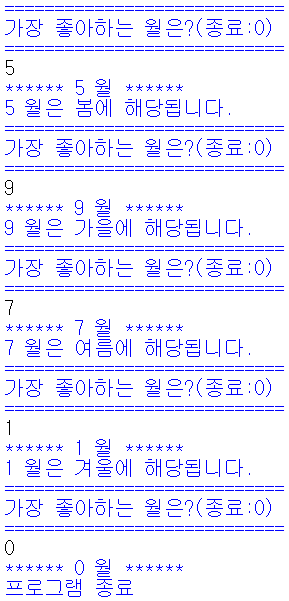 05. 사용자로부터 가장 좋아하는 월을 입력받아 그 월에 해당되는 계절을 출력하는 프로그램을 메뉴 형태로 while문을 사용하여 작성하시오.