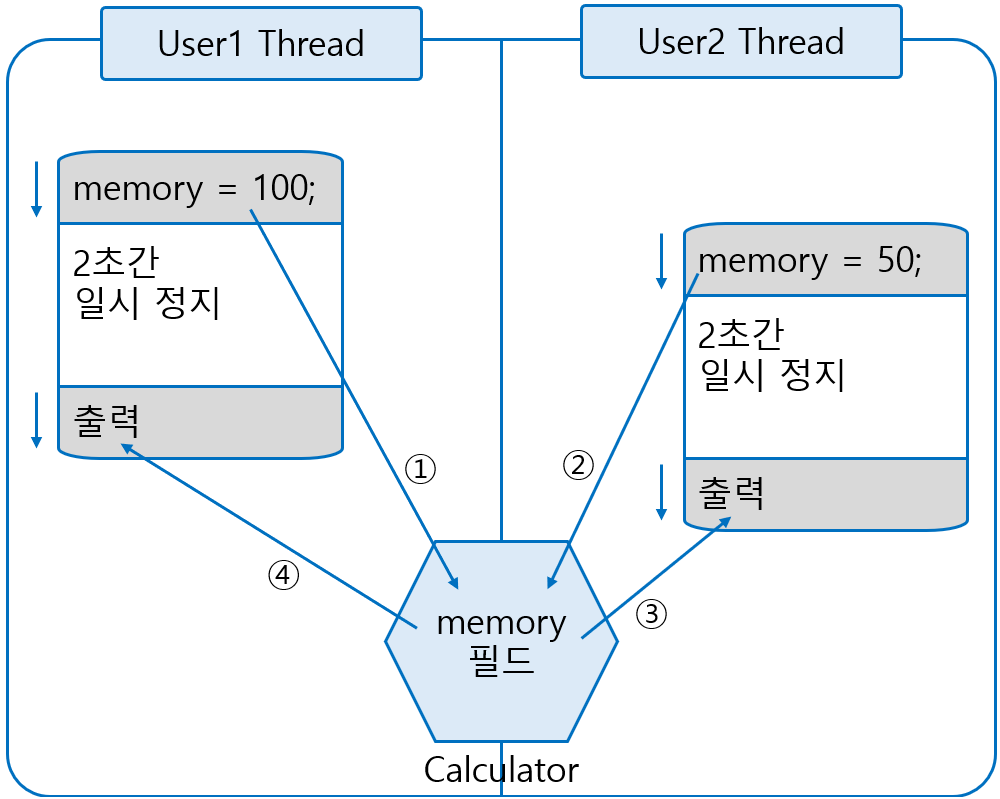 User1Thread는 Calculator 객체의 memory 필드에 100을 먼저 저장하고 2초간 일시 정지 상태가 된다. 그동안 User2Thread가 memory 필드값을 50으로 번경한다. 2초가 지나 User1Thread가 다시 실행 상태가 되어 memory 필드의 값을 출력하면 User2Thread가 저장한 50이 나온다.