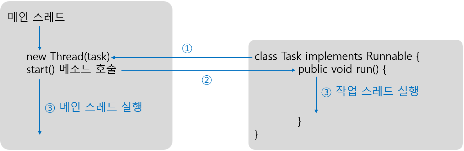 java.lang 패키지에 있는 Thread 클래스로부터 작업 스레드 객체를 직접 생성하려면 다음과 같이 Runnable 구현 객체를 매개값으로 갖는 생성자를 호출하면 된다.