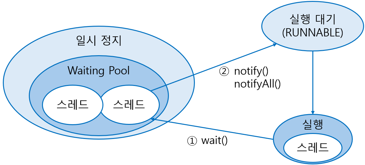 notify()는 wait()에 의해 일시 정지된 스레드 중 한 개를 실행 대기 상태로 만들고, notifyAll()은 wait()에 의해 일시 정지된 모든 스레드를 실행 대기 상태로 만든다. 주의할 점은 이 두 메소드는 동기화 메소드 또는 동기화 블록 내에서만 사용할 수 있다는 점이다.