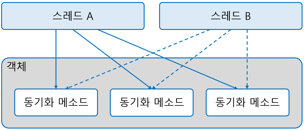 객체 내부에 동기화 메소드와 동기화 블록이 여러 개가 있다면 스레드가 이들 중 하나를 실행할 때 다른 스레드는 해당 메소드는 물론이고 다른 동기화 메소드 및 블록도 실행할 수 없다. 하지만 일반 메소드는 실행이 가능하다.
