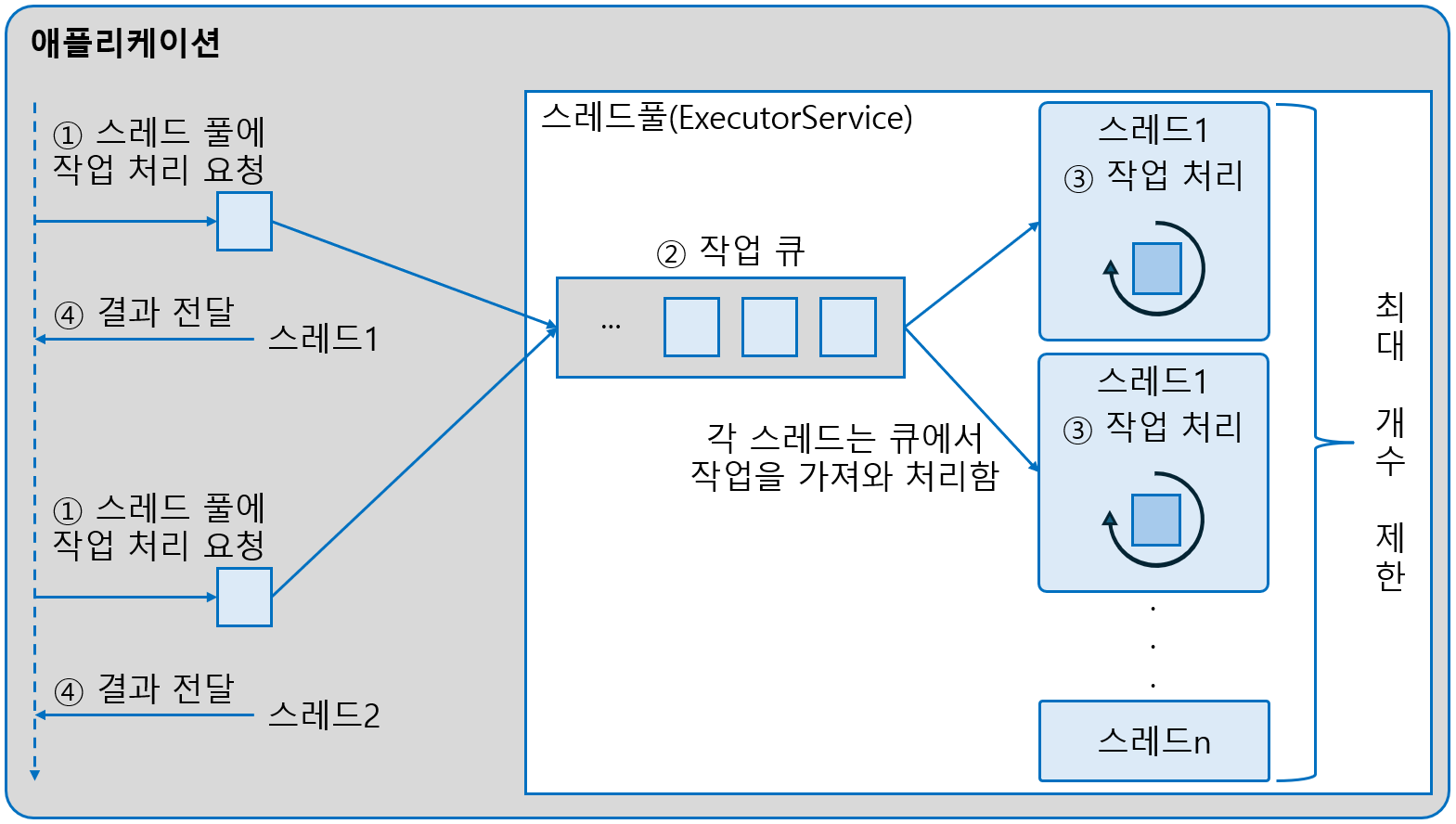Runnable 또는 Callable 객체가 ExecutorService의 작업 큐에 들어가면 ExecutorService는 처리할 스레드가 있는지 보고, 없다면 스레드를 새로 생성시킨다. 스레드는 작업 큐에서 Runnable 또는 Callable 객체를 꺼내와 run() 또는 call() 메소드를 실행하면서 작업을 처리한다.