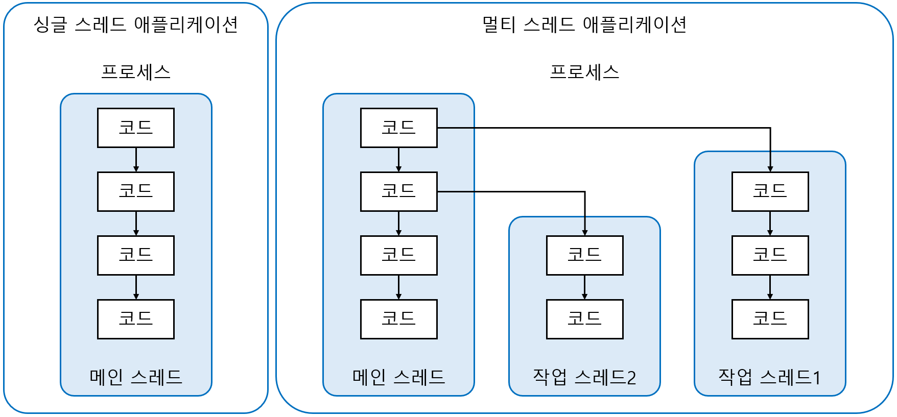 메인 스레드는 필요에 따라 추가 작업 스레들을 만들어서 실행시킬 수 있다. 다음 그림에서 오른쪽의 멀티 스레드를 보면 메인 스레드가 작업 스레드1을 생성하고 실행시킨 다음, 곧이어 작업 스레드2를 생성하고 실행시키는 것을 볼 수 있다.