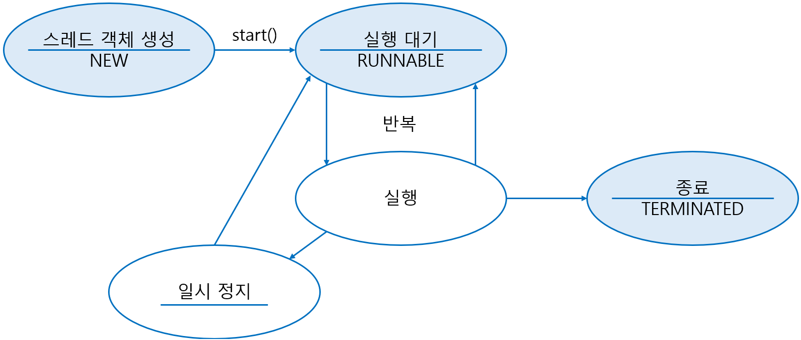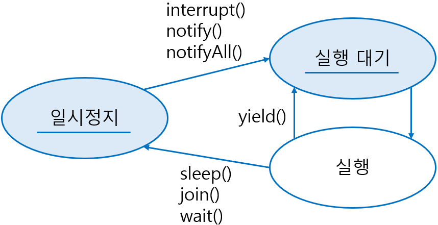 | 일시 정지에서 벗어남 | interrupt() | 일시 정지 상태일 경우, InterruptedException을 발생시켜 실행 대기 상태 또는 종료 상태로 만든다. |