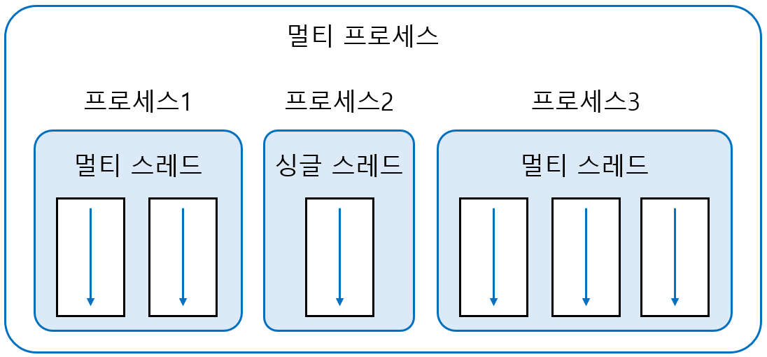 멀티 프로세스가 멀티 프로그램 단위의 멀티 태스킹이라면 멀티 스레드는 프로그램 내부에서의 멀티 태스킹이라고 볼 수 있다.
