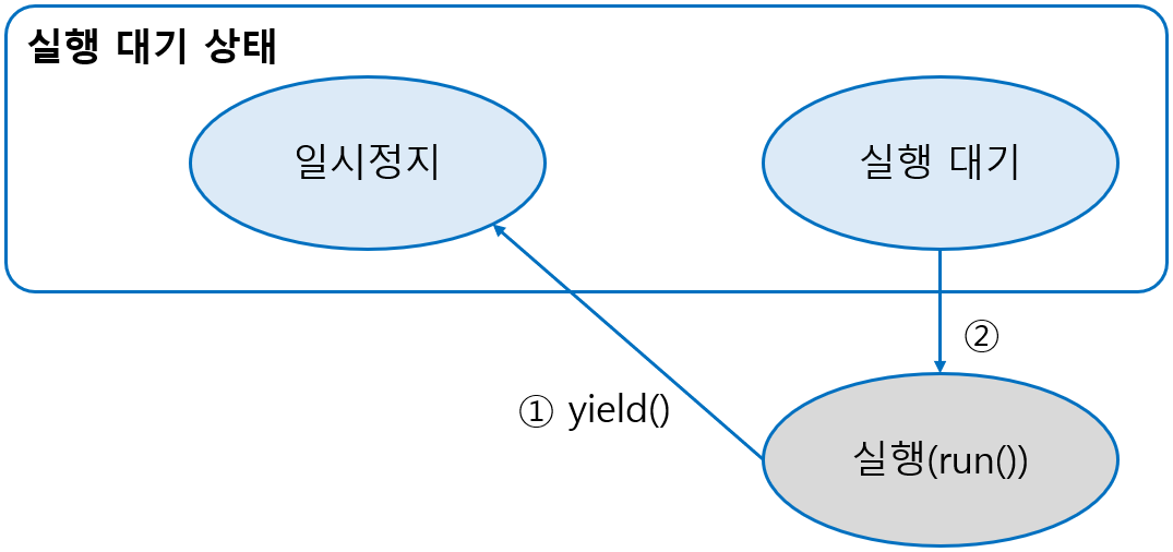 | 실행 대기로 보냄 | yield() | 실행 상태에서 다른 스레드에게 실행을 양보하고 실행 대기 상태가 된다. |