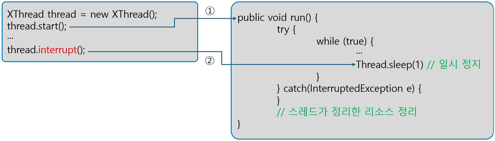 XThread를 생성해서 start() 메소드를 실행한 후에 XThread의 interrupt() 메소드를 실행하면 XThread가 일시 정지 상태가 될 때 InterruptedException이 발생하여 예외 처리 블록으로 이동한다. 이것은 결국 while 문을 빠져나와 자원을 정리하고 스레드가 종료되는 효과를 가져온다.