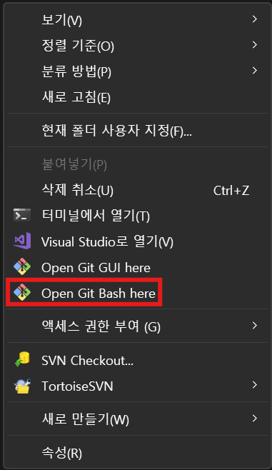 원하는 프로젝트 폴더에서 우클릭한 후 'Open Git Bash here'를 클릭한다.