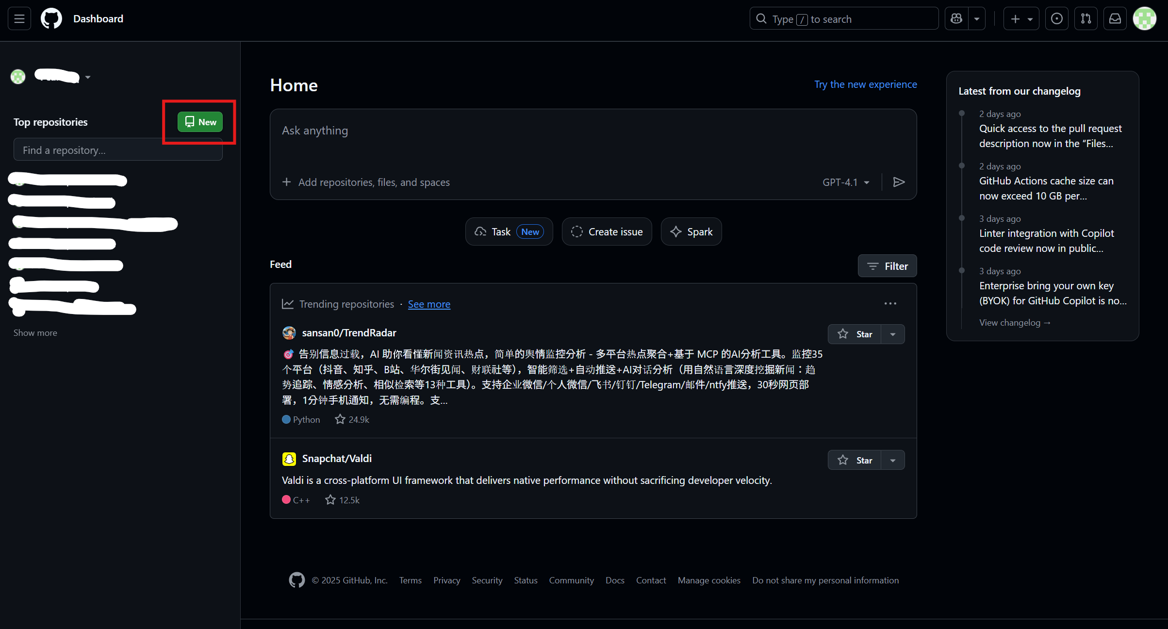 아래의 사진(Github의 Home)에서 'New'를 클릭하여 새로운 프로젝트를 만든다.