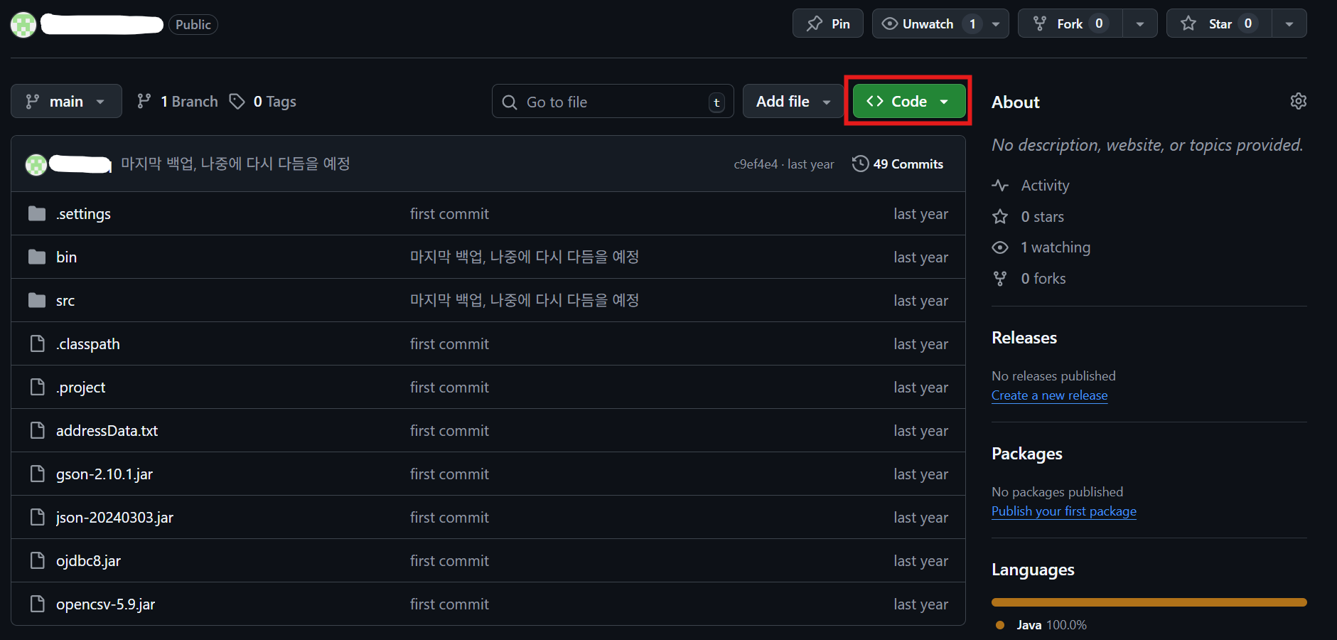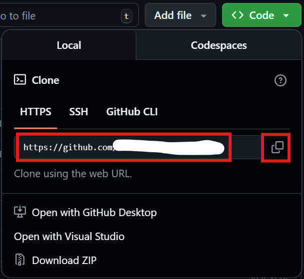 이떄의 깃 주소는 오른쪽 상단에 있는 'Code'를 눌러 나오는 주소를 드래그하거나 복사 버튼을 눌러 복사한다.