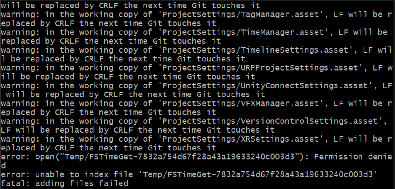 Unity 프로젝트는 'Library/', 'Temp/', 'Logs/' 'Obj/', 'Build/', 'Builds/'와 같은 파일들을 올리게 된다면 아래와 같이 여러 경고 메시지가 뜨며 'error: unable to index file '(파일-이름)''라는 오류가 뜬다.